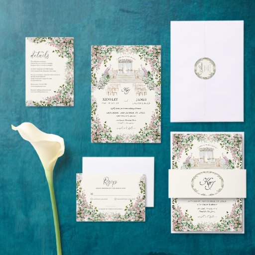 A romantic watercolor garden wedding invitation featuring lush blush blossoms, elegant greenery, and a personalized monogram. This enchanting invitation features a hand-painted garden archway, delicate pink and blush flowers, graceful greenery, and refined seating details that create the perfect blend of artistry and sophistication. Ideal for outdoor, botanical, and spring weddings. Easily customize names, details, and fonts for your perfect celebration.