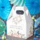 An elegant floral bouquet of pink peonies and ivory roses frame the borders of this lovely girl baby shower favour box. The sprigs of sage leaves decorate in the midst of the array of flowers that surround the beautiful modern typography on pretty boxes. A chic, personalised addition to a garden event.