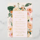 This is a romantic and modern blush pink and peachy floral wedding invitation with real gold foil overlay. Using a design of bohemian and pretty pink and peachy florals and matching soft blush and creamy background colours, edit all of the text as required using the provided template.