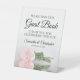 This beautiful pedestal sign will invite your wedding guests to sign your guest book. Features an elegant design with a single long-stemmed blush pink rose lying on its side mirrored in a pool of water. There is space for the names of the couple as well as the wedding date.