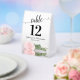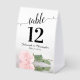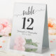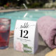 These tent signs will not only help your guests find their tables, they'll also make your wedding reception more beautiful. The design is both elegant and romantic featuring a single pale blush pink rose lying on its side reflecting in water with waves and ripples. The title is in lacy script calligraphy with bold numbers so your guests can easily find the right table. There is room for the names of the couple and the wedding date.