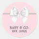 Elegant Blush Pink Tiffany Theme Baby Shower Classic Round Sticker. Pamper the mother to be with a tiffany theme baby shower! This sticker can be used on stationery, favour bags, gifts and prizes to create a chic, modern, retro baby shower for the mummy to be who has everything. The combination of girly blush pink, with pearls and a white bow coordinate with our Tiffany Theme Baby Shower invitations, party decor, tableware and more!