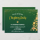 At the top of the image, golden particles and stars cascade down like confetti, adding to the celebratory mood. The overall composition is elegant and festive, with the dark green and gold colours creating a luxurious and warm holiday atmosphere.