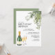 Modern birthday dinner invitations featuring a watercolor illustration of a celebratory champagne bottle with two filled drink glasses. Text is fully editable. The reverse side is a coordinating sage green colour.