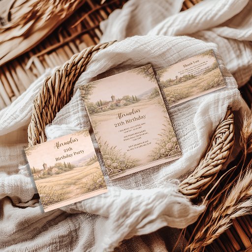 A romantic countryside garden design inspired by classic European estates, featuring soft blush florals, lush greenery, and a timeless vintage palette. The scenic garden path and elegant botanical frame create a warm, refined atmosphere ideal for milestone birthdays and elegant celebrations. Perfect for those who love old-world charm, neutral tones, and a graceful outdoor aesthetic.