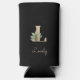 Elegant black can cooler with a gold botanical monogram in the centre.