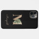 Elegant black phone case features a gold botanical monogram in the centre.