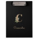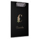 Elegant black clipboard features a gold botanical monogram in the centre.