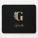Elegant black mouse pad features a gold botanical monogram in the centre.