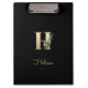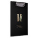 Elegant black clipboard features a gold botanical monogram in the centre.