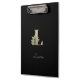 Elegant black clipboard features a gold botanical monogram in the centre.