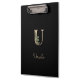 Elegant black clipboard features a gold botanical monogram in the centre.