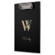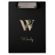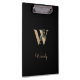 Elegant black clipboard features a gold botanical monogram in the centre.