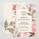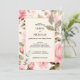 This wedding invitation features a floral background full of pink and white flowers with greenery leaves. It has a simple rectangle with a light colour to keep all texts visible and easy to read.