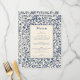 Elevate your wedding reception with this elegant botanical-themed menu, designed to complement a classic and timeless celebration. The sophisticated floral border in deep blue frames the central text, offering a graceful and refined presentation for your guests. With a cream-toned vintage-inspired background design brings a touch of old-world charm to your modern celebration. Perfect for adding an extra layer of beauty to your table setting, this menu guides your guests through the delicious courses planned for your big day. Ideal for couples seeking an elegant, traditional aesthetic for their wedding.