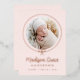 Introducing our Elegant Blush and Rose Gold Foil Bow Photo Birth Announcement, a stunning way to celebrate your little one’s arrival. The baby’s photo is beautifully encircled by a rose gold foil ribbon tied in a bow on a light blush pink background. Your baby's first and middle name appear in elegant calligraphy, with the last name and birth stats below. The back of the announcement offers space for an extra photo and a personal message. This luxurious, customisable keepsake is perfect for sharing your joy with family and friends!