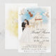 Elegant bridal shower invite featuring Bride and Groom at a scenic classic Piano with Violin, a two doves flying around in the sky, and a gold background with two doves on the reverse