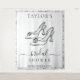 Framed by a modern square border and a delicate black and white botanical floral pattern, the layout offers a clean and timeless aesthetic. The text features a beautiful mix of classic serif and flowing, modern script typography. You can easily personalize the napkin with the bride's name and the event date to create a truly custom piece for your dessert table or cocktail bar.