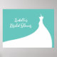 An elegant wedding dress accents this bridal shower poster on a turquoise background. This is part of the Elegant Bridal Shower Collection in turquoise. If additional coordinating items are needed just contact us at prettyfancyinvites@gmail.com with your request.