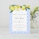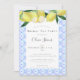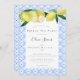 A bridal tea party shower invitation featuring yellow lemons, hand drawn in watercolor and colour pencils over a watercolor pattern of blue tiles inspired by the Mediterranean traditions. Personalise it with the name, the date, the time and all the details. Modern calligraphy for the bride's name.
