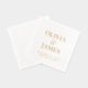 Elevate your wedding events with these elegant foil-stamped napkins, perfect for your reception, rehearsal dinner, engagement party, couples shower, etc. Personalised with your monogram first names in timeless serif typography and your wedding date and location in sleek modern lettering, each napkin is stamped in genuine gold, silver, or rose gold foil for a sophisticated touch.