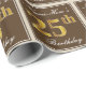 This simple and elegant wrapping paper design features a personalised message like "Name-Here’s 25th Birthday" (with the "25th" having a faux/imitation gold-like colouring look) within a brown-coloured square area featuring a simple border outline. The name is in an elegant white-coloured script-like text, and can be personalised. Wrapping paper like this could perhaps be used when wrapping birthday gifts for somebody who is celebrating their twenty fifth birthday. [~Z0000223]