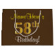 This simple, elegant birthday gift bag design features a personalised message like "NameHere’s 58th Birthday!" (with the "58th" having a faux/imitation gold-like colouring look) on a brown coloured background. The name is in script-like, yellow-coloured text, and can be personalised. A personalised birthday gift bag like this could perhaps be used when giving a present or gift to somebody who is celebrating their fifty eighth birthday. [~Z0000262]