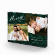 Elegant holiday photo block featuring "Merry" in a modern white calligraphy script on a painted green plaid background. Personalize Christmas photo block by adding two of your favorite photos, greeting, name, and the year.
