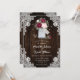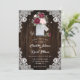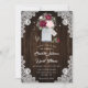 Rustic burgundy and blush wedding invitation featuring a bouquet of baby’s breath flowers, burgundy and blush roses inside a mason jar against a barn wood background adorned with white floral lace and twinkle lights. Perfect card design for inviting your guests to your burgundy and blush rustic wedding party.