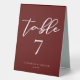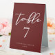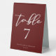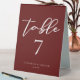 This solid burgundy wedding table number table tent sign features classic white script for a bride and groom getting married at a formal evening venue. Embrace romance with this rich, bold colour. Minimalist and romantic typography decor for a modern couple.