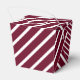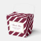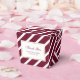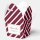 Custom burgundy, white and gold wedding favour boxes featuring a gold grame on a burgundy and white striped background. These personalised thank you favour boxes can be customised to other occasions.