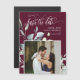 This save the date magnetic card features elegant watercolor greenery foliage leaves arrangements and beautiful calligraphy and simple serif typography font with a square photo frame on a burgundy background for a clean minimalist and modern look, which is a beautiful way to inform about your upcoming wedding or elopement. Just personalise the text and add a personal touch with a beautiful photo of the couple.