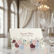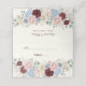 Set a romantic tone with this deep red, blush pink, and dusty blue floral design, perfectly suited for an autumn or late summer reception celebration.This design features a balanced top and bottom botanical garland layout, framing the central text area with generous off-white negative space to ensure clear legibility for guest names and table numbers. The intricate color palette incorporates rich dark red and soft blush blossoms, artfully contrasted by dusty blue hydrangeas and muted sage green eucalyptus leaves. The typography hierarchy pairs a dark crimson, sweeping calligraphy script with a classic, structured uppercase serif font, guiding the eye naturally through the composition.This is a flat printed image with a printed watercolor effect, not actual raised material.