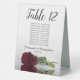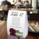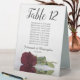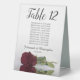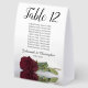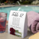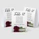 These tent table number signs are not only beautiful, they even include a list of names for the guests at each table, making it easy for your guests to find their seat at your wedding reception. The design is both elegant and romantic featuring a single burgundy, maroon, or wine red coloured rose lying on its side reflecting in water with waves and ripples. The title is in lacy script calligraphy with bold numbers so your guests can easily find the right table. There is room for the names of the couple and the wedding date.