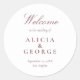 Classic chic calligraphy couple's names wedding favour or envelope seal round sticker featuring a dark red elegant typography script against a clear white background. ++++++++ Personalise with the bride's and groom's names and with your custom text!