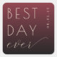 This square sticker features a sophisticated design with a gradient background transitioning from deep burgundy to dark maroon, creating a warm and elegant atmosphere. The phrase "BEST DAY ever" is prominently displayed in bold uppercase letters paired with a flowing script font, adding a celebratory touch. A customizable date placeholder allows for personalization, making it perfect for marking special occasions like anniversaries or birthdays. The modern typography and rich color palette convey joy and significance, ideal for commemorating memorable events.