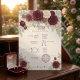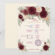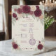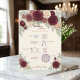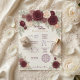 Guide guests seamlessly through your special day with this sophisticated, vintage-inspired itinerary featuring rich botanical art and a soft cream backdrop.This stationery piece is designed with an off-white cream background, establishing a refined typographic hierarchy using classic dark charcoal serif headings and flowing handwritten script accents. The centered text layout is gracefully framed by soft, watercolor-style rose blossoms and leafy foliage in deep red, blush pink, and muted sage green tones. Delicate line-art icons—including champagne glasses, a dining plate, and a globe—clearly map out the day's events to guide the reader's eye down the schedule. This is a flat printed image with a soft watercolor painted effect, not actual raised material or hand-painted canvas.