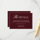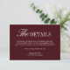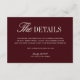 Provide guests with all the essential information in style with this elegant wedding details card. Featuring a deep burgundy background paired with refined serif and script typography, this insert is perfect for formal, vineyard, or evening weddings. Use it to share travel directions, hotel accommodations, RSVP instructions, or your wedding website link. Fully customisable. Coordinates with the matching “Sabrina” —follow the link on this page to view matching signage, menus, invitations, and more. • Mockups for this design were created using Midjourney AI.