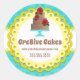 © 2021 Socialite Designs. Elegant cake bakery sticker design incorporating a turquoise damask pattern background, yellow scalloped border banner for your text, and a chocolate swirl cake with flower details.