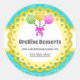 © 2021 Socialite Designs. Elegant cake pops bakery sticker design incorporating a turquoise damask pattern background, yellow scalloped border banner for your text, and a colourful cake pops design.