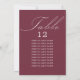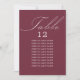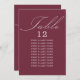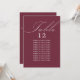 Burgundy wedding table seating card with elegant calligraphy and editable typography. Simple, modern minimalist design to suit your wedding colours. Table is lettered in handwritten script and the template is ready for you to edit the table number and your guest seating list.