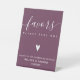 NewParkLane - Sophisticated Personalised Wedding Favours Table Pedestal Sign, with a fun elegant whitescript typography /calligraphy with swirls, a cute tiny heart, against a burgundy / plum background, perfect for a fall wedding.