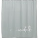 Elegant Feminine Minimalist Sage Green Monogram Name Script Signature Custom Personalised Bathroom Shower Curtain. This design featuring your first name in a hand lettered style swash tail font signature typography (or calligraphy) on sage green or dusty green colour background. Great stylish feminine housewarming gift, anniversary, wedding, also for birthday, bridal shower, bachelorette party and It’s for the girl who likes clean minimalist things.