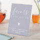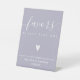 NewParkLane - Sophisticated Personalised Wedding Favours Table Pedestal Sign, with a fun elegant whitescript typography /calligraphy with swirls, a cute tiny heart, against a lavender / purple background.