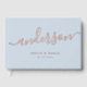 Elegant wedding guest book with the new surname in an elegant calligraphy script font. Real foil text on a light dusty blue or custom colour background. The background colour can be changed in the design tool.