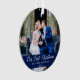 Elegant Calligraphy Script Our First Christmas Photo Blue Ornament with Snowflakes back - Perfect for a Wedding Photo or Couple Photo