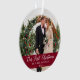Elegant Calligraphy Script Our First Christmas Photo Burgundy Ornament with Snowflakes back - Perfect for a Wedding Photo or Couple Photo