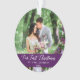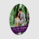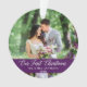 Elegant Calligraphy Script Our First Christmas Photo Purple Ornament with Snowflakes back - Perfect for a Wedding Photo or Couple Photo