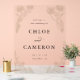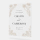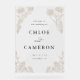 Design features elegant vintage calligraphy inspired by traditional script fonts. The design includes delicate hand-drawn floral arch inspired by garden trellis with intertwined roses, flowers and leaves. Minimalist and elegant perfect for traditional and garden wedding.