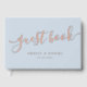 Elegant wedding guest book with the text "guest book" in an elegant calligraphy script font. Real foil text on dusty blue or custom colour background. The background colour can be changed in the design tool.